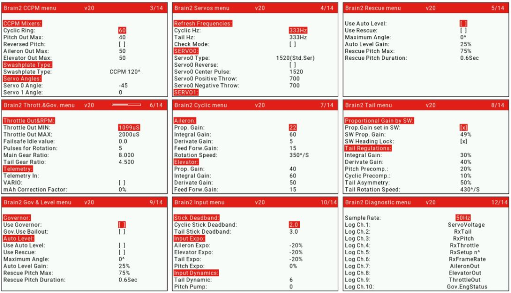 As Crossfire is a full-duplex serial interface most ELRS receivers support telemetry. MSH provides EdgeTX/OpenTX Brain 2 LUA script App that can be used to configure the FBL controller directly from your EdgeTX Radio Controller. The image below shows some of the screens from the Brain2 LUA script App.