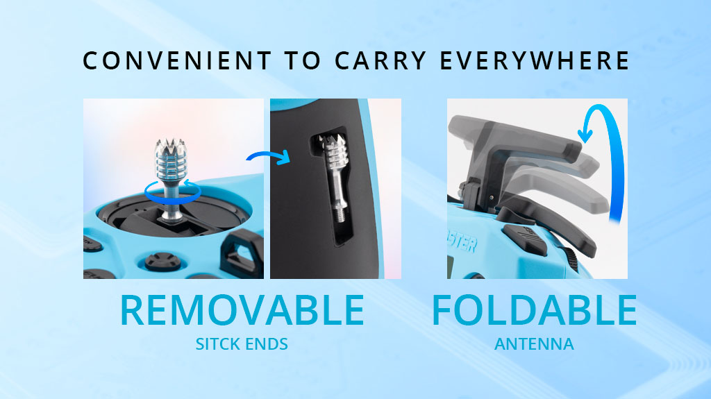 It come preinstalled with EdgeTX firmware. The Pocket is also equipped with removable stick ends and a fold-able antenna, making it easy to transport and store. It is compatible with 18650 batteries, which provide long battery life for hours of fun.